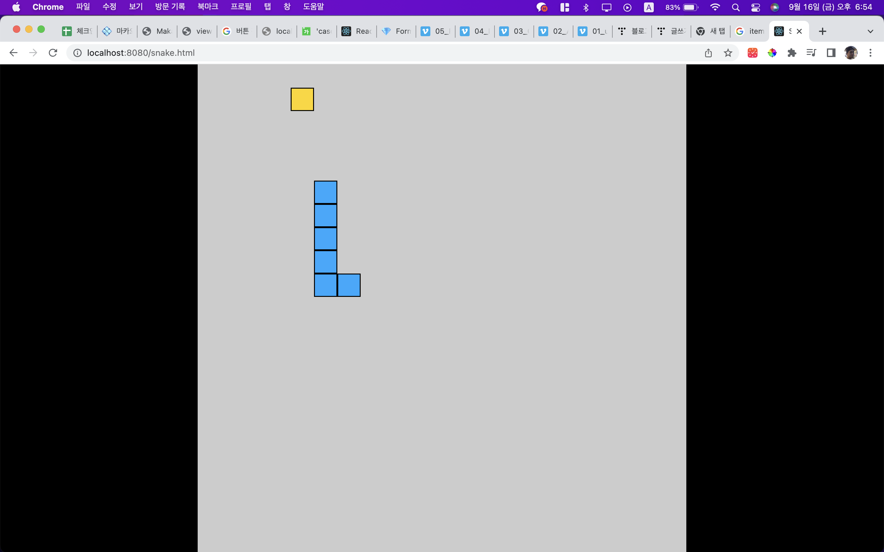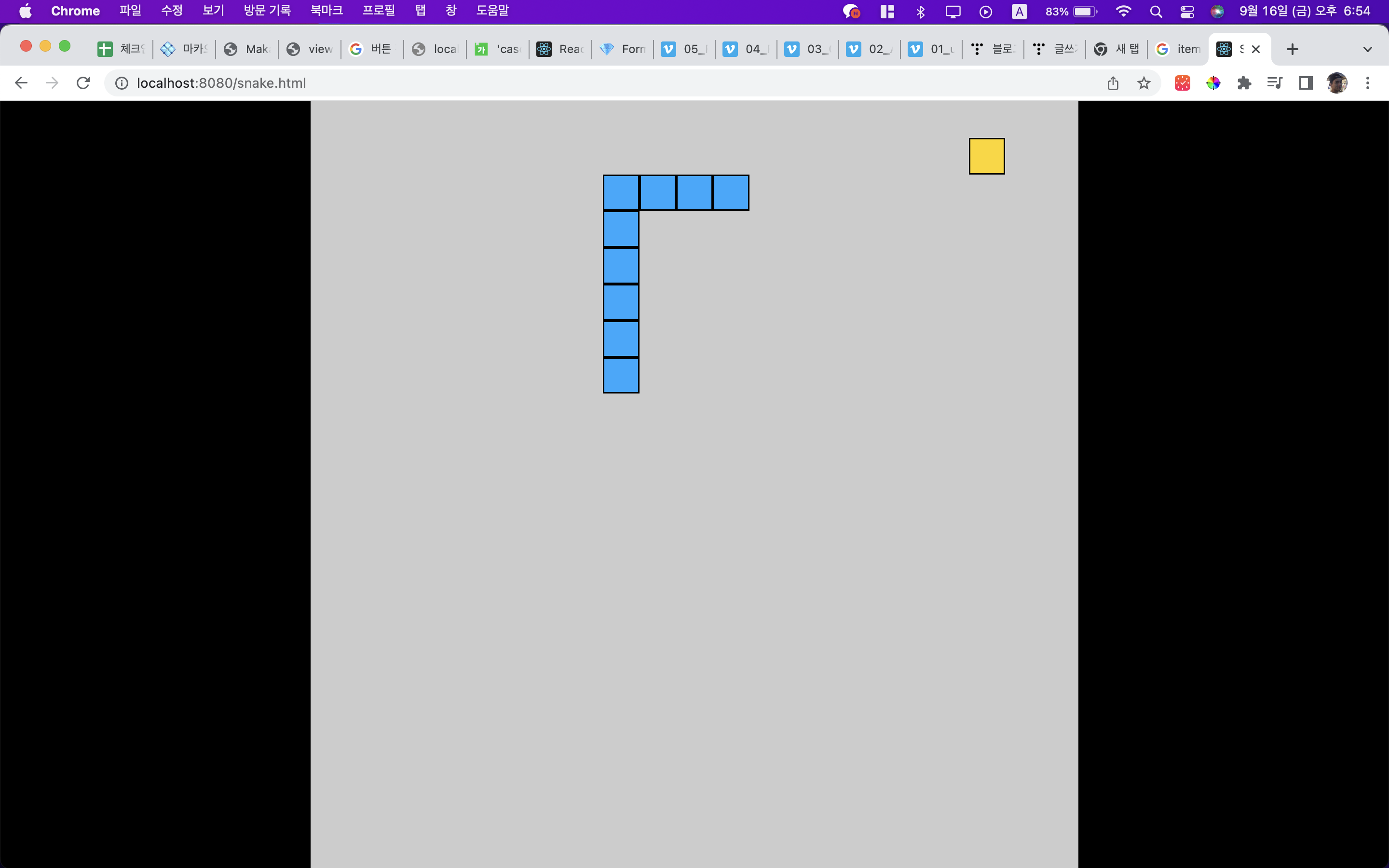 자율과제중에서 무엇을 할까 하다가 사다리게임을 만들어볼까하다가 정보가 너무 적어서 선택한 것이 스네이크 게임 클론 코딩이었다. 이상하게 한국은 자료가 잘없는데 그래도 영어로 치다보니 조금 있어서 어찌어찌 똑같이 해도 되지않는 부분을 수정하면서 만들었는데 나름 재미가 있었다.