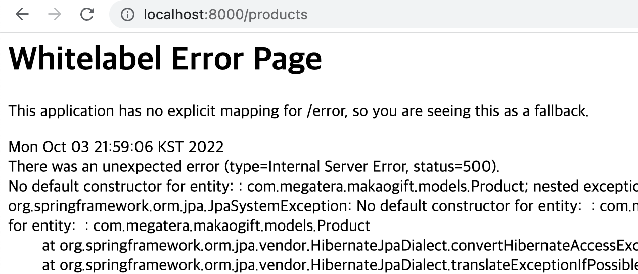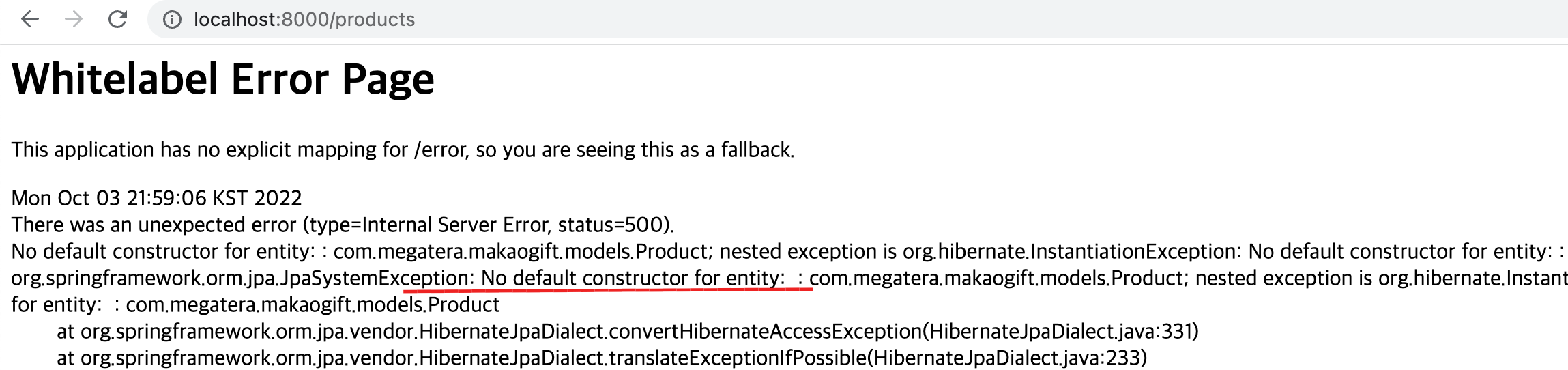 원래 습관처럼 빈 생성자와 게터를 모두 만들어주는데 ( 가장 흔히 까먹고 찾기 어려운 오류라서)