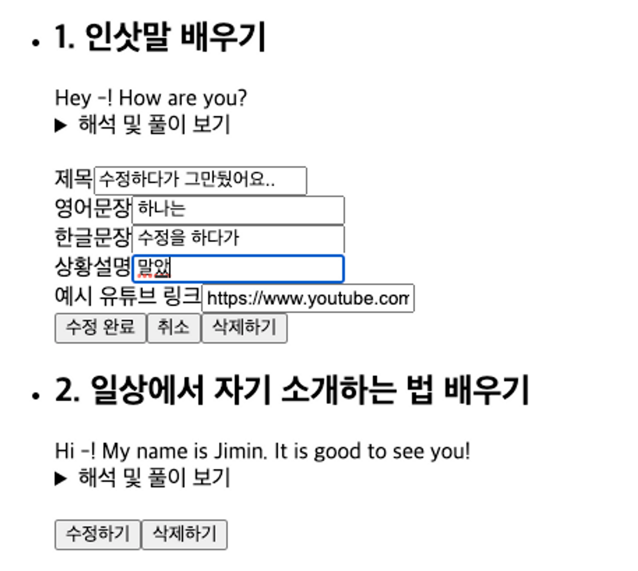 아래와 같이 수정하다가 다른 수정하기를 누르고 돌아와도 여전히 저렇게 남아있다.