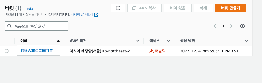 버킷의 액세스가 아래처럼 퍼블릭이라고 되어있어야 버킷의 객체를 클릭했을때 access denied가 뜨지 않는다.