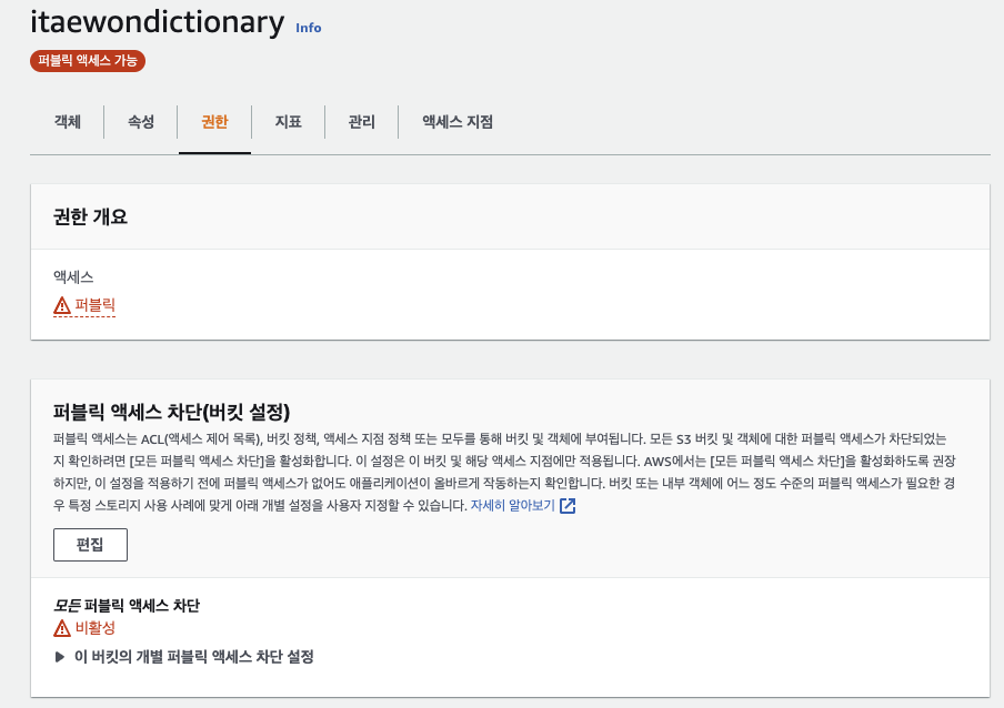 임의의 퍼블릭 버킷 또는 액세스 ~~~~ 교차 계정 액세스 차단 이라는 부분이 반드시 해제가 되어 있어야한다.