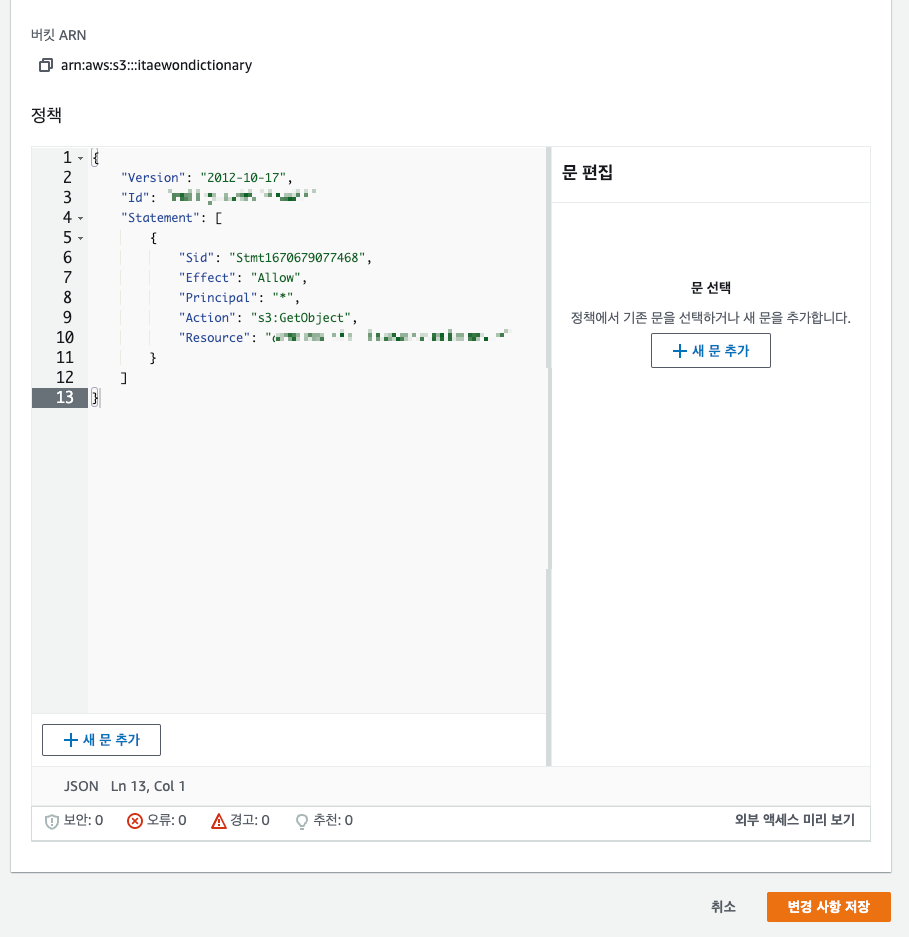 ARN 이름은 버킷정책편집 페이지 상단에 버킷ARN 이라고 되어잇는걸 복사해온다.